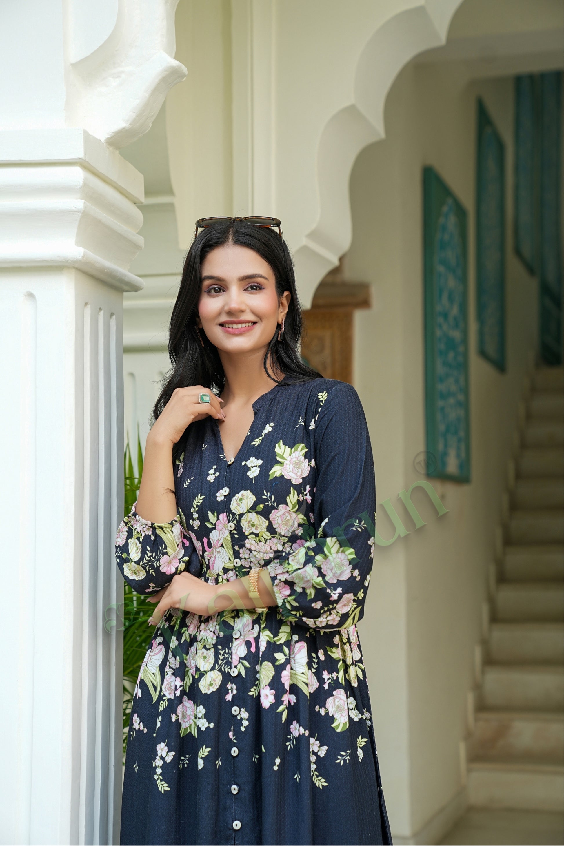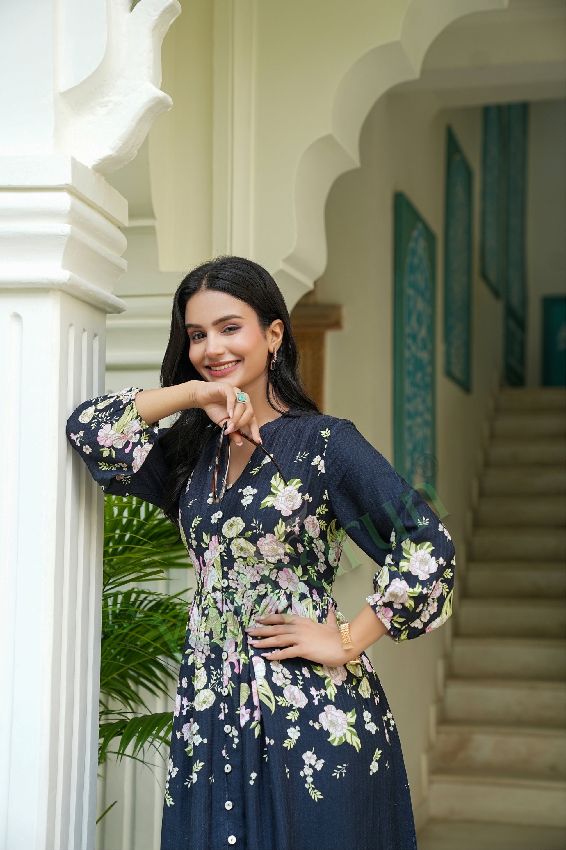 Embrace sophisticated elegance with the Kalparun Floral Print Rayon Dobby Short Dress in 'Midnight Bloom'. This exquisite short dress combines deep navy blue fabric with delicate blush pink floral motifs, creating a striking contrast that exudes timeless charm. Designed for the contemporary woman who appreciates refined details, this dress features a flattering V-neckline, elegant long sleeves, and a classic button-front closure. Crafted from premium rayon dobby fabric, this dress offers a subtle textured appearance while maintaining the soft, flowy drape that rayon is known for. Perfect for evening gatherings, dinner dates, or special occasions, this dress seamlessly blends vintage inspiration with modern sensibility.