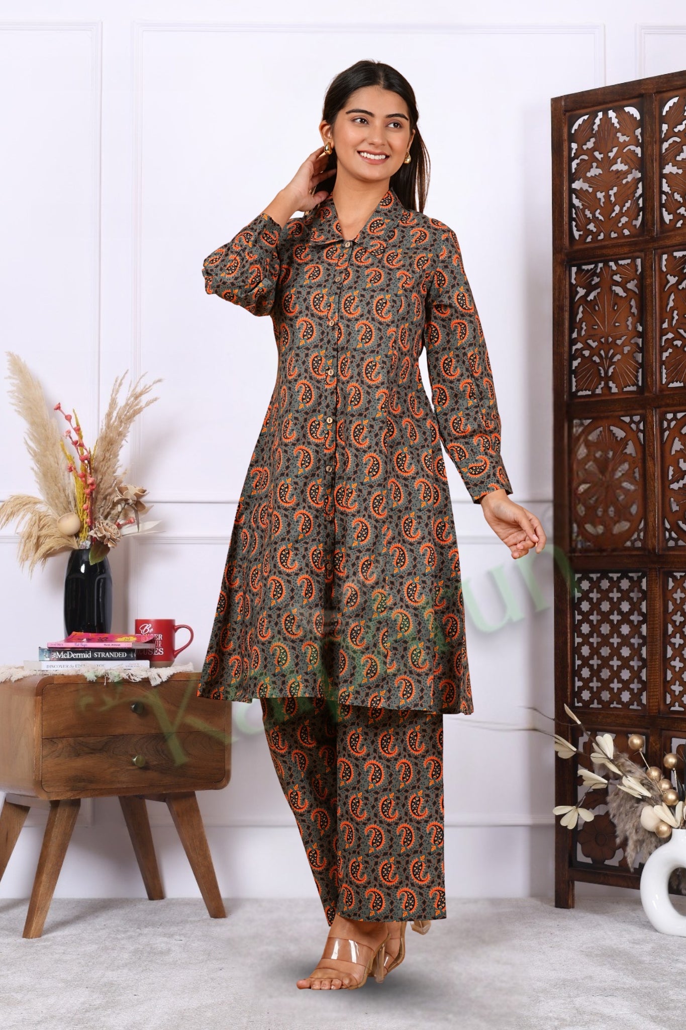 Kalparun Women's Paisley Print Cotton Kurta Pant Set, Button-Down Kurta Set, Grey and Orange